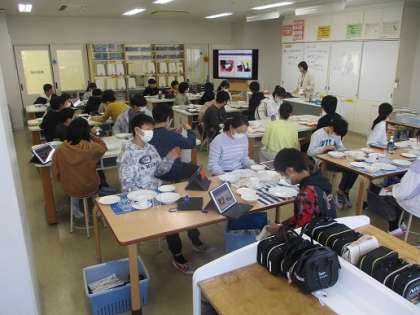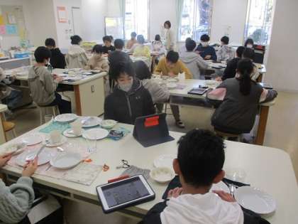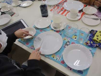 6年生は2月後半に洋食でのマナー会食を予定しています。家庭科室でその事前学習に取り組んでいる学級がありました。ナプキンの利用の仕方、ナイフやフォーク、スプーンの使い方などについて、説明を聞いたり、自分でタブレットで確かめたりするなどしていました。