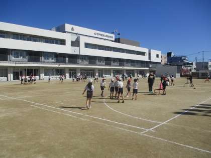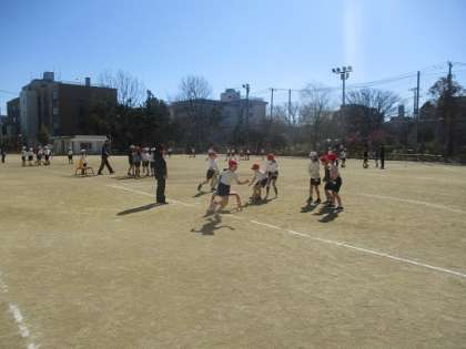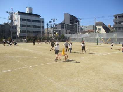 2年生の校庭での体育。置かれたボールを手で叩いて転がして走ります。守りの子どもたちはボールを取り、そのボールを囲んで座ったら、打った子の動きはストップ。ベースボール型ゲームの基本となるような動きを近い距離から少しずつ初めていました。
