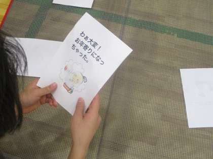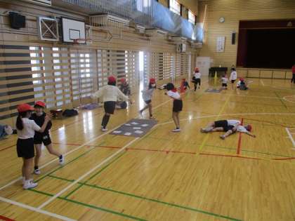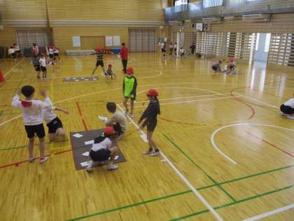裏返しに置かれた何枚かのカード。合図でめくると「うさぎに変身」などの指示が書かれています。めくった子は指示された動きを実際にやってみます。4年生の体育、表現の内容です。どうすればそれらしく見えるか、友だちとも相談して取り組んでいました。