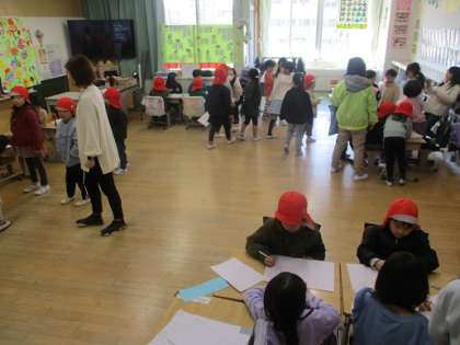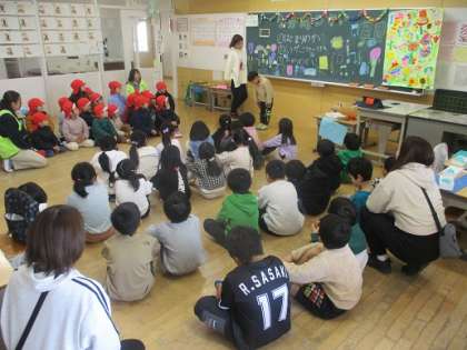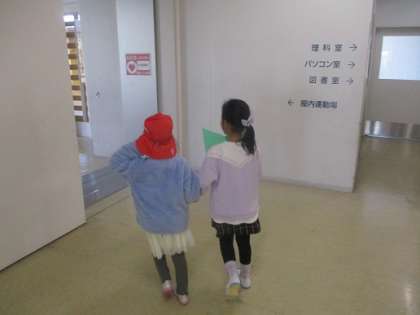 近隣保育園の子どもたちが来校し、1年生の学級と交流しました。はじめの会をして、教室で昔遊びをしたり、本を読んで聞かせたり、一緒に校内を探検したり・・・。小学校への興味や関心を高めてもらえるようがんばっていました。