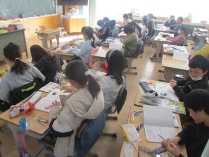 算数で三角形の学習を進めている3年生。二等辺三角形を描くという活動に取り組んでいました。2つの辺の長さを同じにして描いていくにはコンパスが有効です。まだ手付きは慣れませんが、がんばって取り組んでいました。