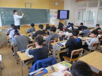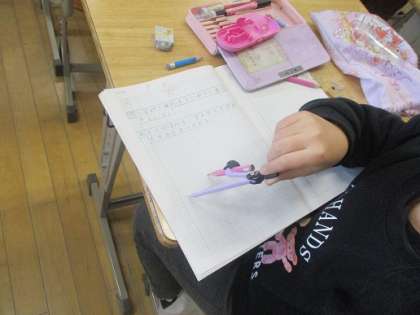 算数で三角形の学習を進めている3年生。二等辺三角形を描くという活動に取り組んでいました。2つの辺の長さを同じにして描いていくにはコンパスが有効です。まだ手付きは慣れませんが、がんばって取り組んでいました。