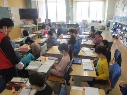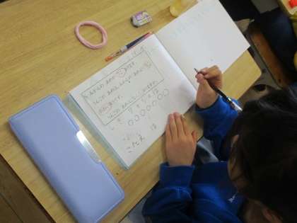 「みかんの飴が7個、りんごの飴はみかんより5個多い。りんごの飴はいくつ?」1年生の算数の問題です。算数では、問題をよく読んで、どういう場面なのかをイメージすることが大切です。絵に描くなどして思い浮かべている子もいました。