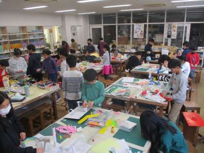 5年生の図工です。ビー玉を転がすいろいろなコースを作っていました。上から下にスムーズに転がっていくか、カーブは大丈夫かなどに気を配りながら、試行錯誤しながらだんだん形になってきていました。