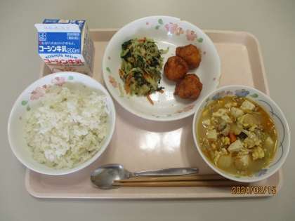 献立は、ご飯、ヤンニョムチキンボール、スンドゥブチゲ、チョレギサラダ、牛乳でした。