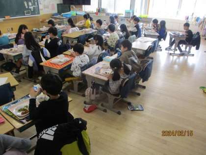 写真は2年4組の給食風景。今日は韓国の料理です。辛さ控え目なので、子どもたちも元気に食べていました。