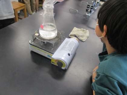 水を沸騰させると泡が出てきます。それは何か?水の中にある空気、水に溶けきれなかった空気、ビーカーについている空気・・・いろんな予想が出てきました。いったい何なのかを実験を通して解明しようとしていました。