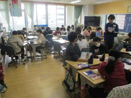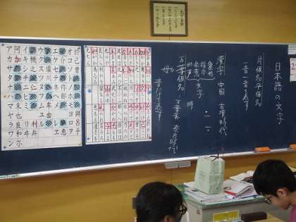 日本語の文字、平仮名、片仮名は一つの文字で一音を表します。そして、仮名は時代とともに変化してきており、古くは万葉仮名などがあります。そうした文字の学習を6年生の国語で取り組んでいました。暗号を解くような感じの子もいました。