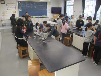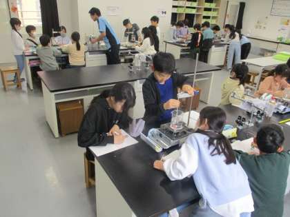 ビーカーに入れた水を熱するといろいろな変化が生じます。湯気が出始めるのは何度になったら?などの課題について4年生が理科で調べていました。ストップウォッチを横に、温度計を注視し「ビーカーが曇ってきた」などの反応を、経過した時間、温度とともに記録していました。
