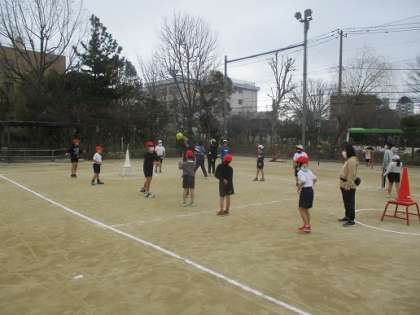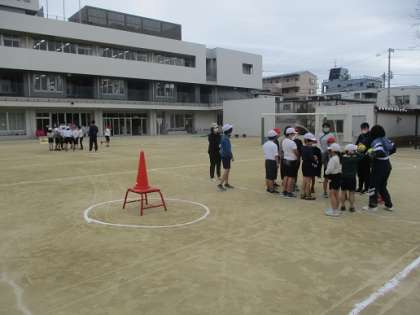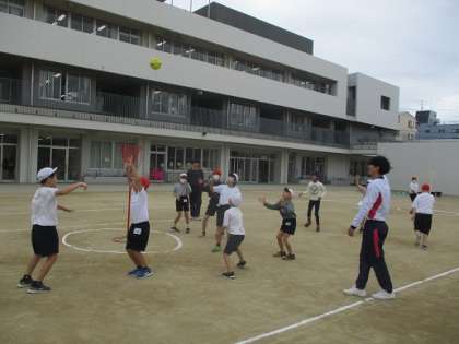 おおぞら学級の体育はコートでのゲーム。高学年中心のグループは玉入れのカゴをゴールにボールを入れ、低学年中心のグループは台の上のコーンを倒すゲーム。チームに分かれ、パスをしながら楽しみました。