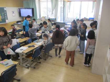 国語で「アレクサンダとぜんまいねずみ」という話を読んでいる2年生。「むねをどきどきさせて・・・」という表現に、どれくらいどきどきしているかをハートで色を塗って表し、その理由を友だちと交流していました。