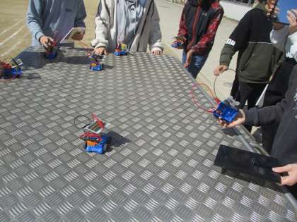 6年生が理科で試していたのはソーラーカー。鏡で集めた光を車のソーラーパネルに当てて走らせます。光による発電や、電気は運動に変換することができることなどについて学んでいました。