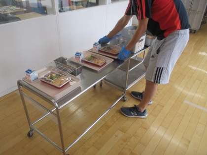 午前登校の子どもたちには11時前に、午後登校の子どもたちには12時頃に、弁当箱に詰めた形で教室前に届けます。給食室の調理師も必死の作業を続けています。