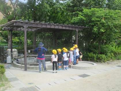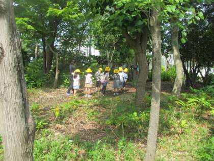 1年生は屋外での活動を行いました。なかよしの森の中に入って、花や実を見付けたり、いろんな虫を探したり。カメの池ではカメの様子に見入っていました。みんなで少し身体を動かすゲームをして、表情が柔らかくなっていく子どもたちがたくさんいました。