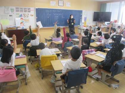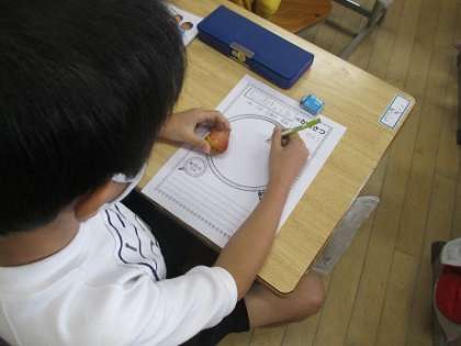 1年生がチューリップの球根の観察をしていました。チューリップはどんな色があるかなどを話し合い、一人一人に配られた球根が配られました。そして球根の様子をカードにかきます。どんな花が咲くか、みんな楽しみに観察していました。