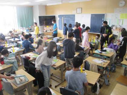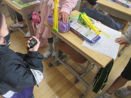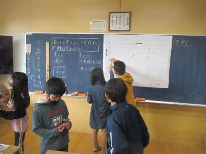 5年生が理科でふりこの学習に取り組んでいます。ひもの長さを変えると往復する時間は変わるかどうか。予想を立てて実験に取り組んでいました。みんなの結果を黒板の紙にまとめてだんだんみえてくるものがありました。
