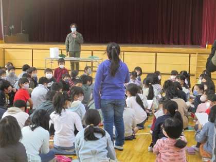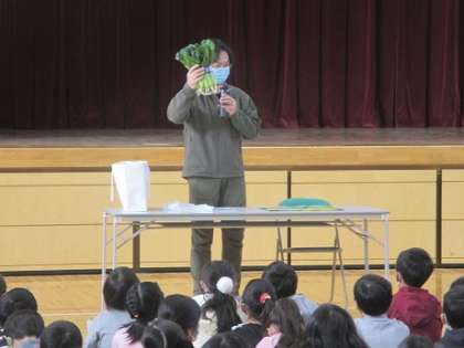 地域のことを学習している3年生が小松菜農家の方からお話をうかがいました。みんなが給食などで親しんでいる小松菜。食べるまでにはさまざまな工夫や努力があります。たくさんの質問も出て、興味をもってお話をうかがいました。