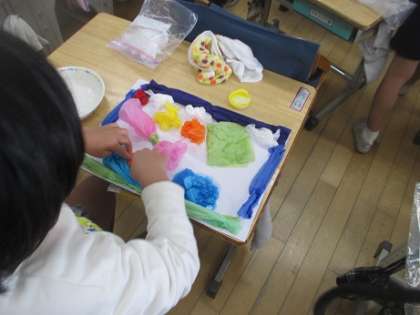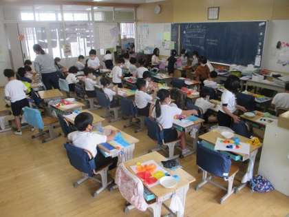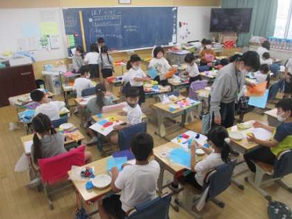 1年生の図工は「はってかさねて」。はながみを折ったり固めたりしながら作ったもの、形などを台紙に貼って作品にしていきます。かなり立体的になっている作品もあって、普段の絵とは少し違った楽しさがありました。