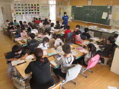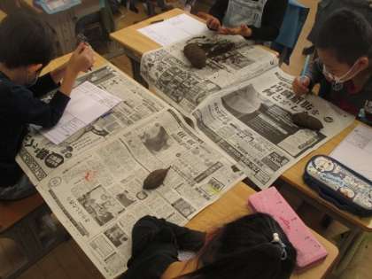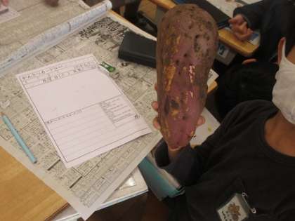2年生が畑で育ててきたさつまいもが採れました。そのいもを観察カードに書いている学級がありました。中には特大のいももあって「カードに入らない」と話す子もいました。どのいももなかなか味わい深い姿をしていました。
