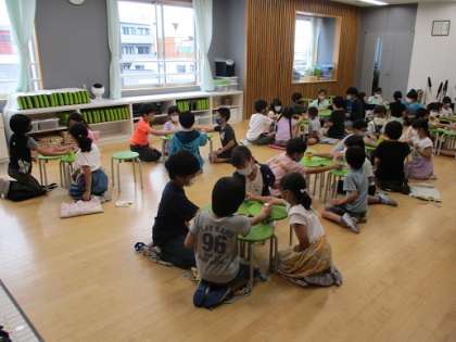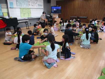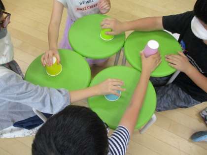 4人で向かい合って座り、右手に紙コップを持ちます。音楽のリズムに合わせ8拍で右隣の友だちの前へ。それを曲に合わせて続けていきます。真剣な、そして楽しそうな子どもたち。一曲終わって大喜びでした。
