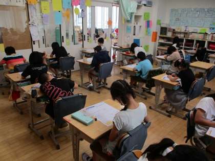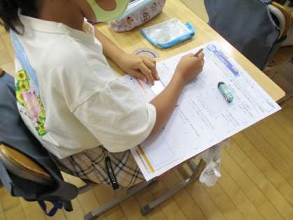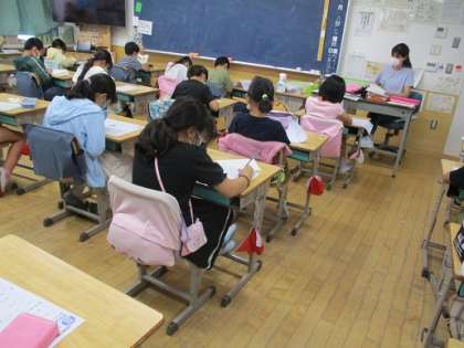 1学期も残りわずかとなりました。それぞれの学級では1学期の学習のまとめ、ふり返りなどを進めています。4年生の学級でもまとめのワークテストが行われており、子どもたちの真剣な表情がたくさん見られました。