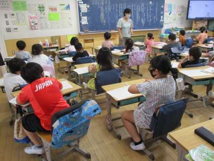 1年生の国語です。一学期、大きく成長した1年生。これまでを振り返って、みんなに知らせたいことを決めて文で表す学習です。いつ、何の、どんなことが、などをワークシートにメモをしながら、何について書いていくかを考えていました。