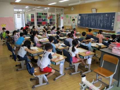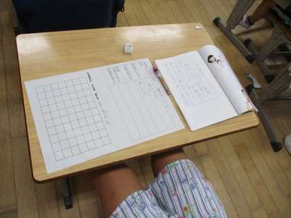 1年生の国語です。一学期、大きく成長した1年生。これまでを振り返って、みんなに知らせたいことを決めて文で表す学習です。いつ、何の、どんなことが、などをワークシートにメモをしながら、何について書いていくかを考えていました。