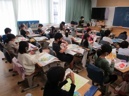 3年生の図工です。紙皿や毛糸、プチプチなどで作った花にインクを塗って版画にしました。今日はその花を切り取って台紙に貼っていく準備です。どのような作品に仕上がっていくか、とても楽しみです。