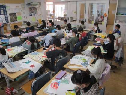 3年生の図工です。紙皿や毛糸、プチプチなどで作った花にインクを塗って版画にしました。今日はその花を切り取って台紙に貼っていく準備です。どのような作品に仕上がっていくか、とても楽しみです。