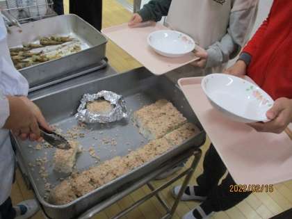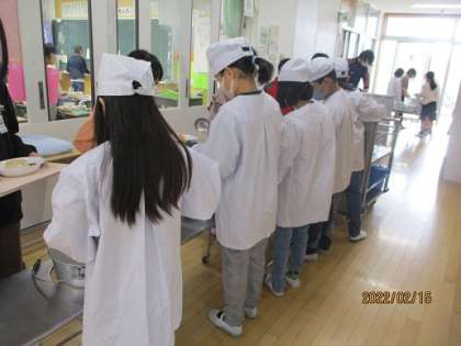 写真は4年3組の給食準備風景。食缶の中にある切り分けられているます寿司を1人1人に配るなどしていました。