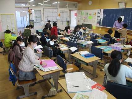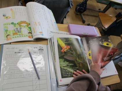 1年生の国語です。動物にかかわる本を探し、その本を読んで題名や作者、出てきた動物の名前をメモしていきます。お話での動物園をつくっていました。本へ親しむ一つの機会になっていたようです。