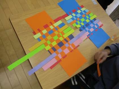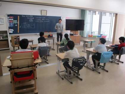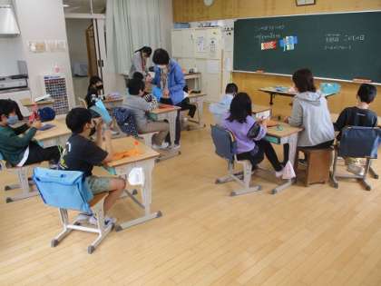 おおぞら学級4組の教室では日本の行事を取り上げ、子どもの日とは何かを確かめていました。また、5組の教室では子どもの日にちなんでこいのぼりづくりに取り組んでいました。