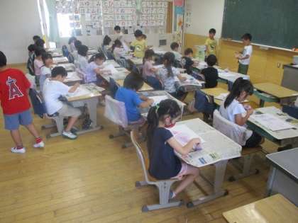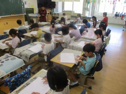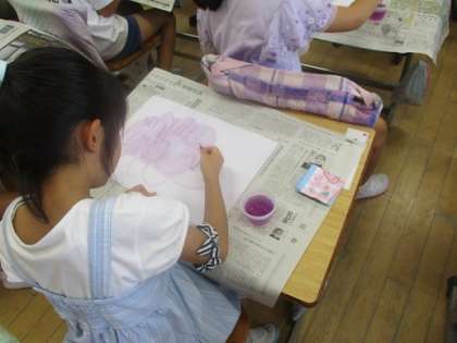 あさがおの葉を水に浸し、軽く絞ると色が出てきます。その色を画用紙にたらしたり、絵絵や模様を描いたりする活動を1年生が行っていました。生活科の学習です。毎日、たくさんの花が開いています。