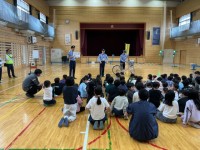 葛西警察の方のご指導で、不審者対応訓練を行いました。写真上:侵入したばかりの様子。写真中:職員が対応している様子。(迫力ありました!)写真下:集会で警察官の方からお話をしていただきました。 (不審者、絶対に来ないでください!)