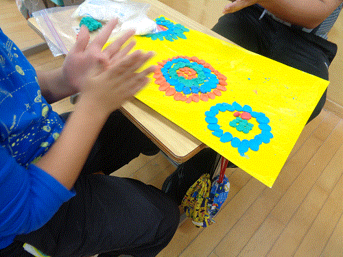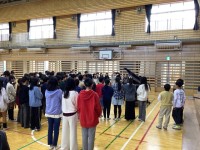 写真上:6年生の出し物(歌)の様子。6年生がすくっと立ち上がった時は、歓声が起こりました。