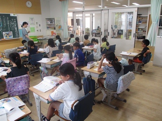 3年生が道徳で「えがおいっぱい」という作品をもとに学習を進めていました。「えがおいっぱい」という学級の目標があるのに、けんかやこそこそ話が絶えないという内容。何が問題か、よさは何か、などを確認しながら、よい学級にしていくことについて考えていました。