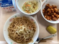 今日の献立は、みそラーメン、レバーとポテトと大豆のマリアナソース、中華サラダ、バ...