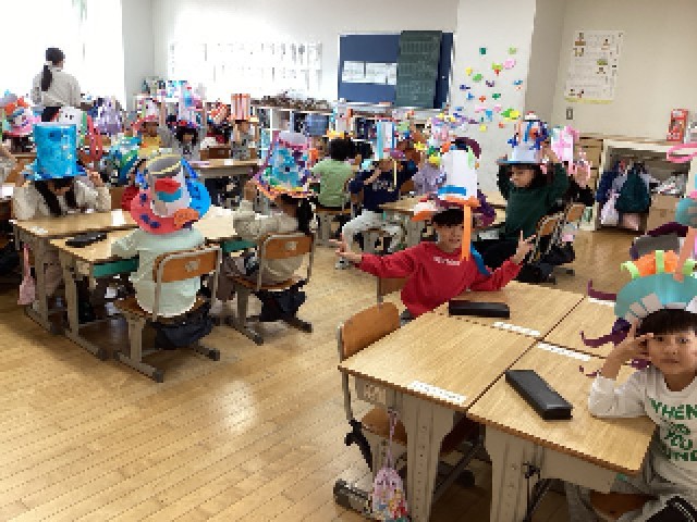 1年生の「すてきなぼうし」が完成し、みんなでお披露目をしていました。みんな自分ら...