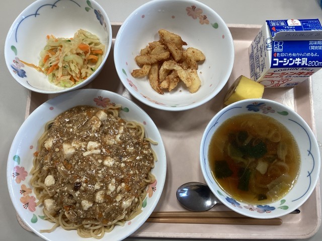 今日の献立は、麻婆ラーメン、アーモンドフライドポテト、大根サラダ、バナナ、牛乳で...