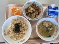 今日の献立は、いなりずし、イカのもみじ揚げ、具だくさんみそ汁、ツナと茎わかめの和...