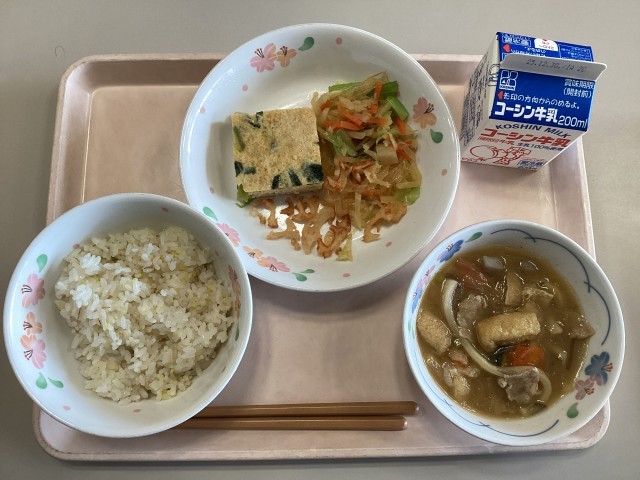 今日の献立は、もちきびご飯、厚焼き玉子、レンコンチップサラダ、冬至のうんどん汁、...
