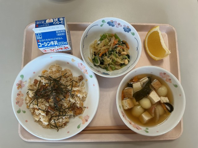 今日の献立は、焼き鳥ご飯、じゃがもち汁、大豆と野菜のアーモンドあえ、みしょうかん...
