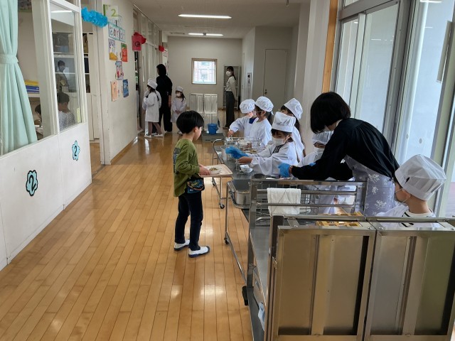 1年生の給食3日目です。配膳を自分たちでできるようになってきました。今日の「焼き...