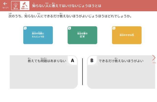 道徳授業地区公開講座の道徳授業で、4年生は「守りたい自分の情報」というテーマで学習しました。授業の後半では、タブレットの中のアプリ「GIGAワークブックとうきょう」を活用して、個人情報の大切さについて学びました。