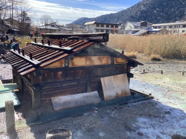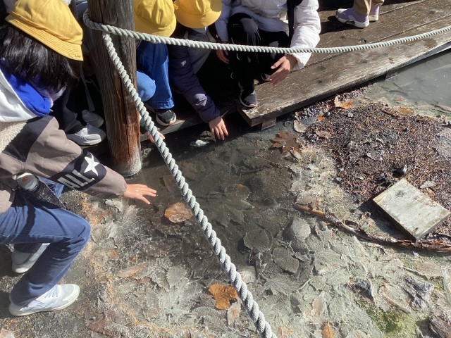 時折、硫黄温泉の独特な香りを嗅ぎながら見学し、源泉に手を入れたりしていました。