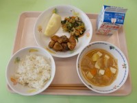今日の献立は、・吹き寄せごはん・牛乳・揚げ豆腐の野菜あんかけ・かぼちゃ白玉汁・み...