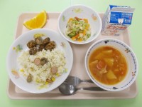 今日のこんだては、・きのこピラフ・牛乳・レバーのガーリック揚げ・まめまめサラダ・...