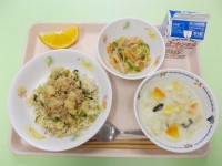 今日の献立は、・小松菜チャーハン・牛乳・春雨サラダ・白菜と豆腐の中華ミルクスープ...