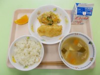今日の献立は、・ごはん・牛乳・いかフライ・小松菜とツナの甘酢和え・じゃがいものみ...