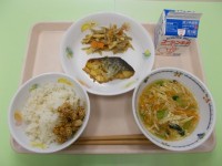 今日の献立は、・ごはん・あげ大豆のごまがらめ・牛乳・さばのしょうゆ焼き・ごぼうと...